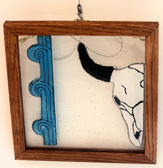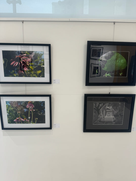 Jay explores how removing or intensifying light can change what we notice. His infrared images reveal tones and surfaces that sit just beyond normal sight. Cyanotypes capture the exact moment sunlight touched the page and record patterns shaped by both chemistry and time. His glass vessels bend and reflect color as viewers move around them, creating a sense of motion across the surface.