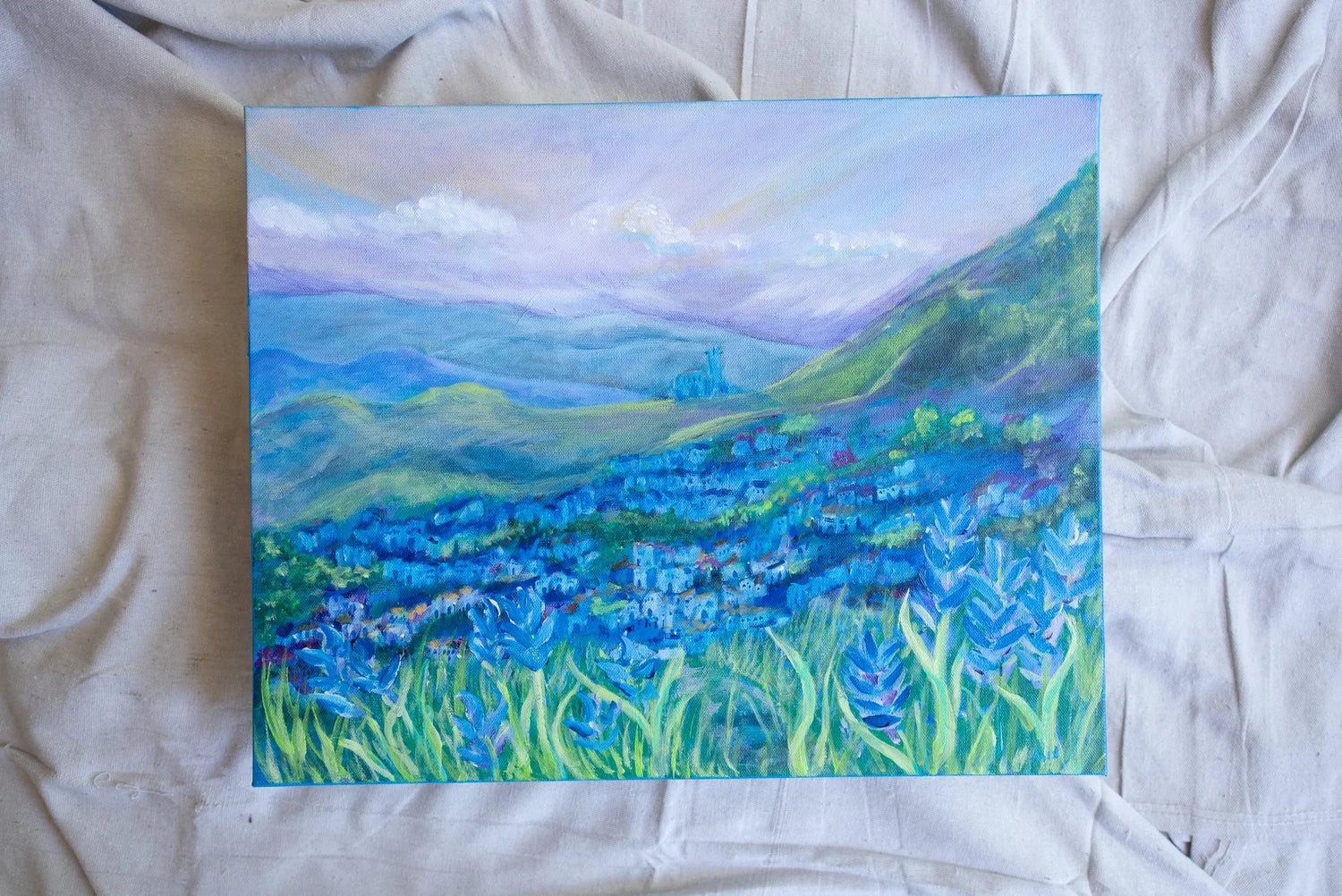 This print captures a landscape that shifts as you look at it. At first you see a sweep of cool blues and soft textures that feel like a field of flowers. With a closer look the shapes gather into a hillside city, filled with stacked homes, winding paths, and hints of daily life. The work reflects the dreamlike feeling of arriving in Chefchaouen, where the entire city is washed in shades of blue that blur into the mountains around it.