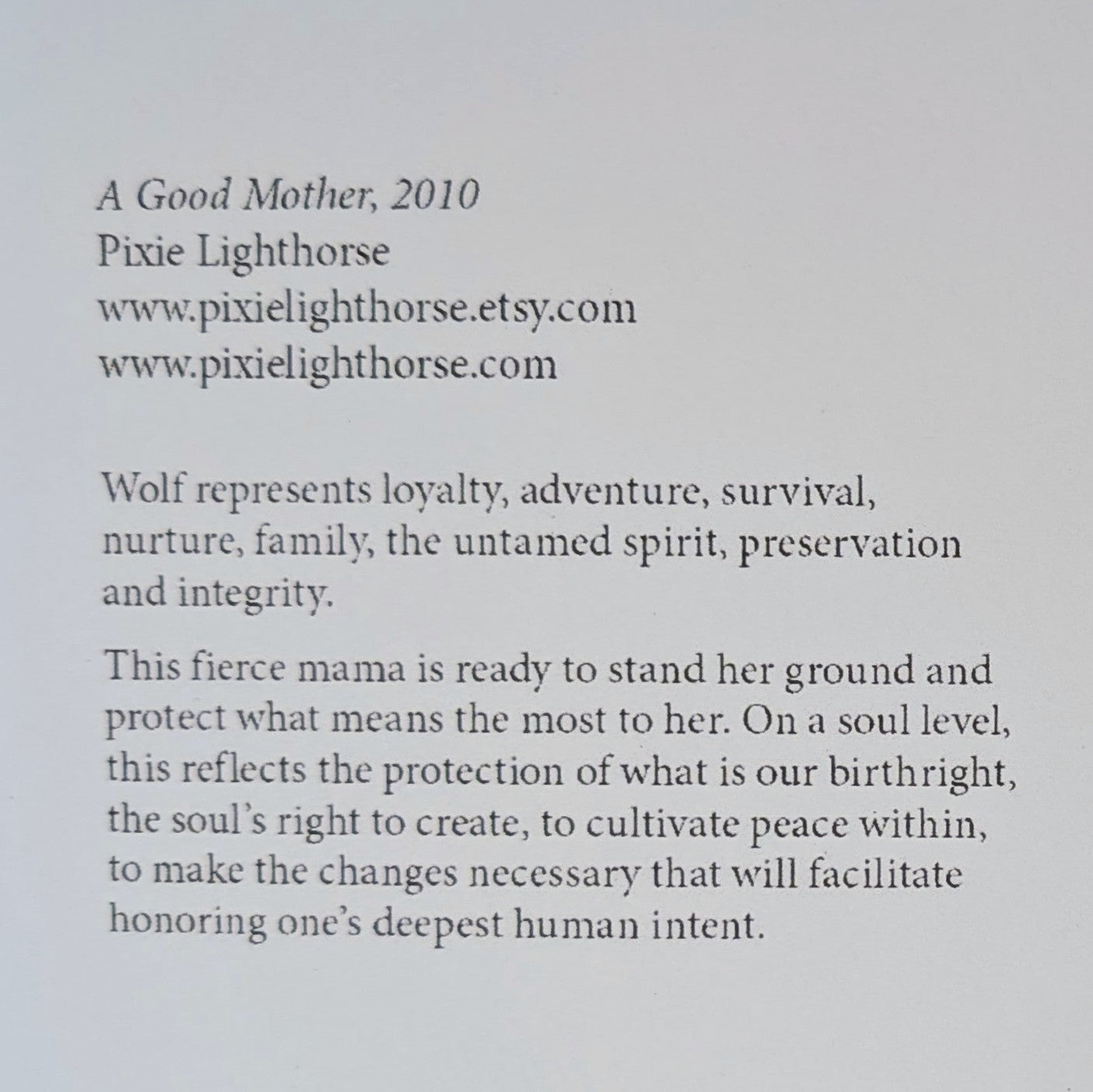 This piece centers on the wolf as a symbol of loyalty, adventure, survival, and the deep bonds of family. Wolf carries the energy of the untamed spirit, preservation, and integrity. She embodies the fierce protector, the one who stands her ground and defends what matters most.