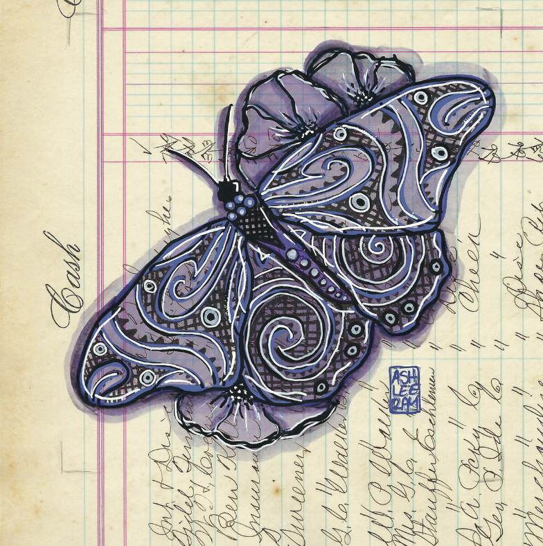 Ashlee Ray, a Chickasaw citizen and Adai Caddo descendant, is an artist from Ada, Oklahoma. Originally from Dallas, Texas she moved in 2019 to follow her career in the arts where she curates and installs First American exhibits. Her work focuses on combining digital illustration and First American southeastern motifs/iconography as a way of connecting with her culture that she did not have growing up. Her style is heavily influenced by animated films with thick lines and harsher shadows resulting in whimsical depictions surrounded by cultural imagery. She has recently begun utilizing a variety of media (watercolor, posca markers, acrylic, alcohol markers, etc.) on ledger paper to translate her style into a physical depiction as a way to add texture to her work.