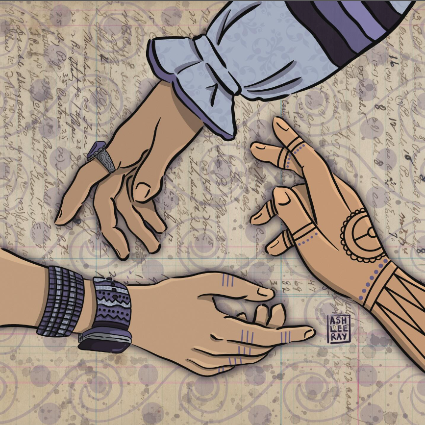 Three Chikasha women reaching towards their communities future. Chickasaw women are the culture bearers and storytellers, carrying traditions and hope for the future of our people. I carry an echo of those before me, in hope that it will continue beyond myself. In this image we see our proud ancestors who have passed on, the women who were forcibly removed from their land and culture, and the woman we are now reconnecting to past traditions and practices.