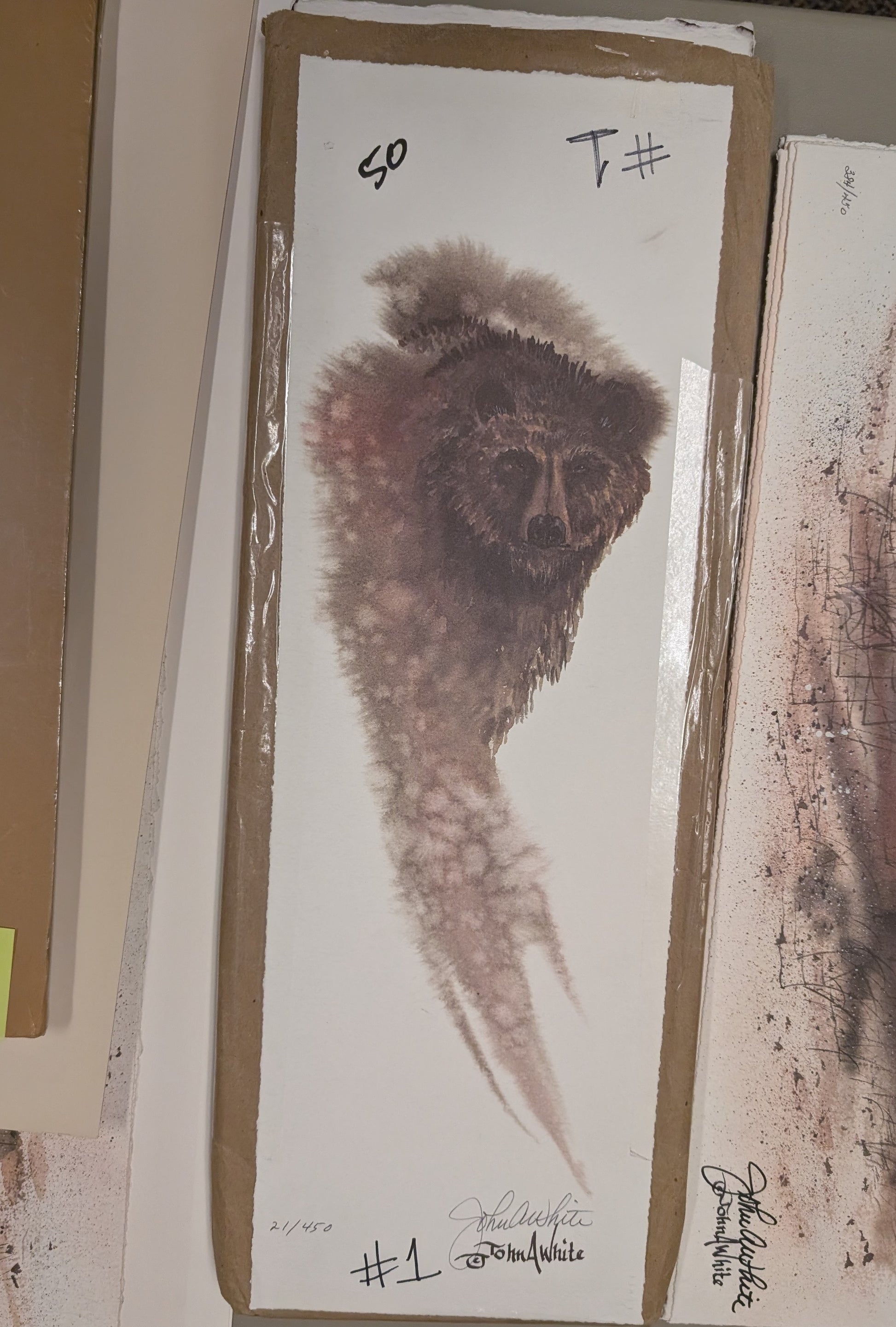 This 7 ¼” H x 21 ¾” W print by John A. White is a striking representation of a bear, a symbol of strength and resilience in many Indigenous cultures. With his signature precision and artistry, White captures the powerful presence of the bear against the backdrop of the Southwest, showcasing his talent for evoking emotion and cultural depth in his work.