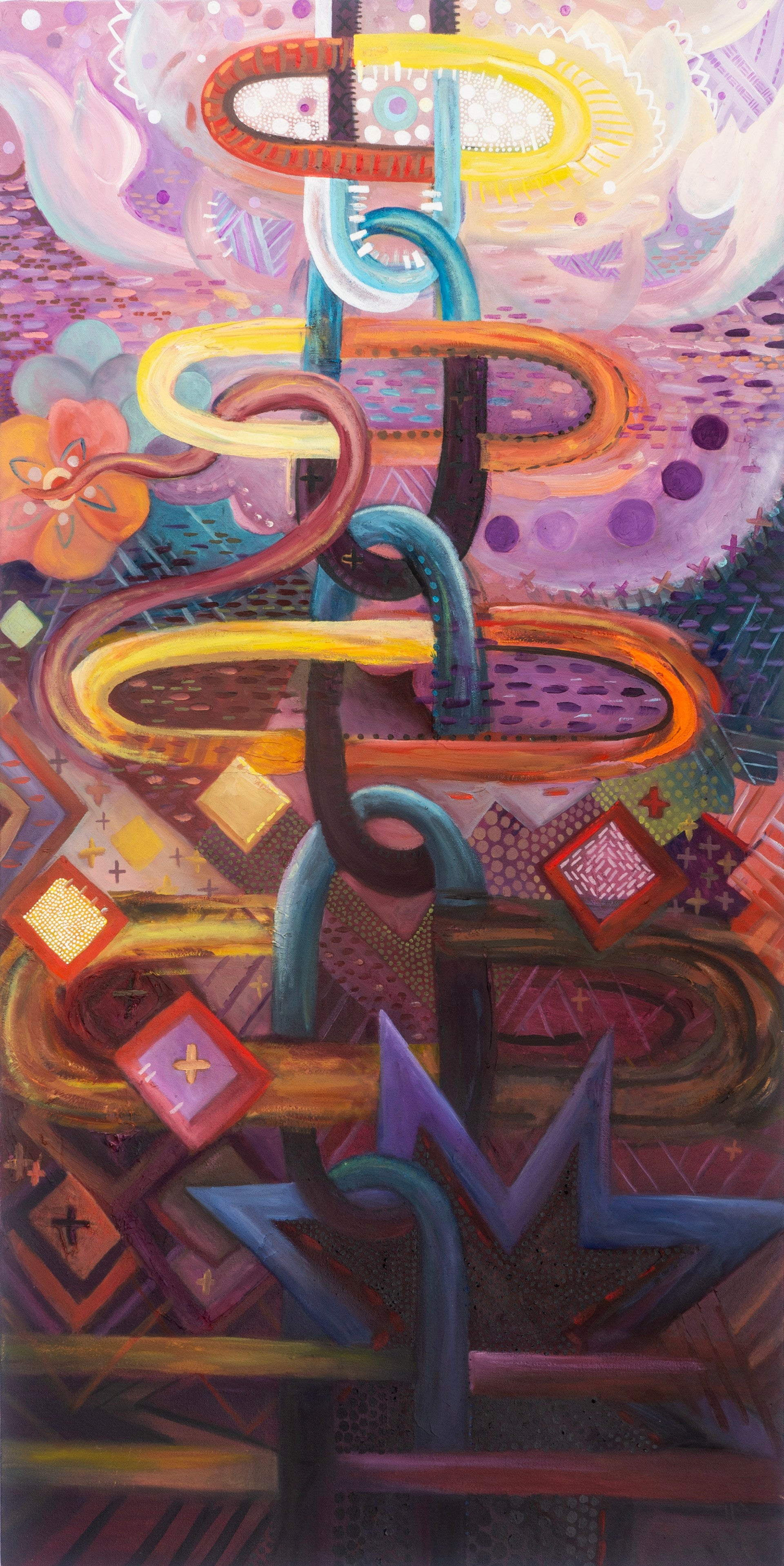 This painting references generations and how they are inextricably linked together yet still ebb and fade as they go. I used a Cherokee Gorget symbol to represent matrilineal ancestry and each specific life- mine, my mother, my grandmother, my great grandmother, and great great grandmother.