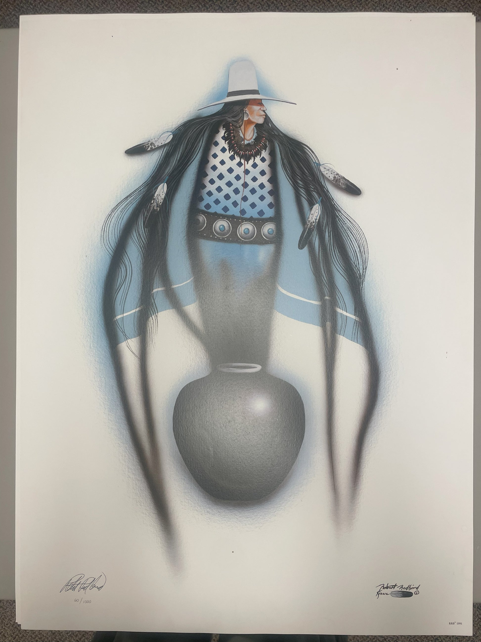 This 23” W x 31” H poster print by the renowned Kiowa artist Robert Redbird, created in 1991, features a striking image that captures the essence of Southwestern culture. The composition depicts a classic cowboy hat resting atop a beautifully crafted black pottery vessel, blending symbols of rugged individualism with timeless artistry.