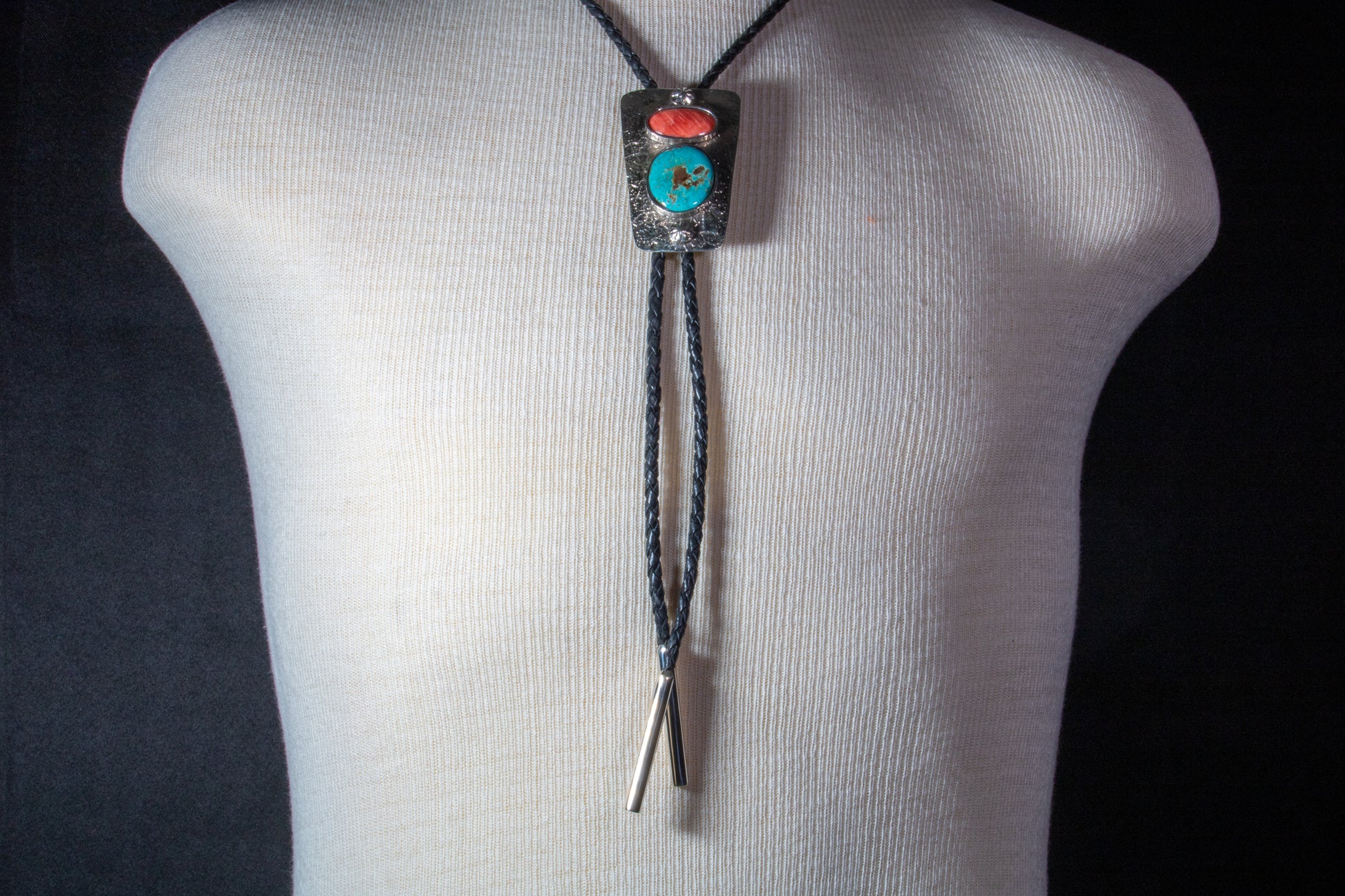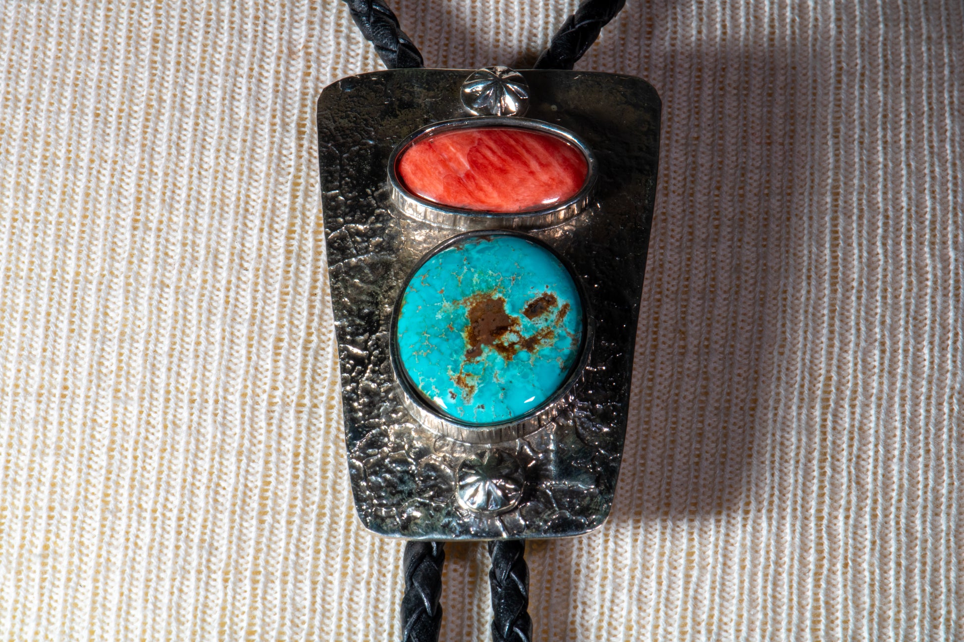 This bolo tie by Ray “Duck” Garcia of San Felipe Pueblo is created using a tufa cast technique, which produces a textured surface with natural depth and character. The centerpiece features two bezel-set stones that form a balanced vertical layout. At the top is an oval spiny oyster shell cabochon with warm orange tones. Below it sits a round Kingman turquoise cabochon with rich blue color that contrasts well with the shell.