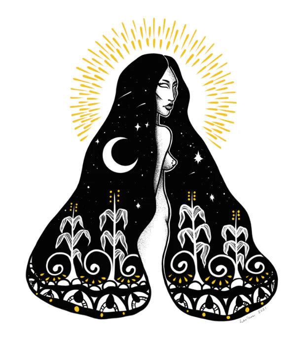 Rooted in her deep connection with community, Leilani's art honors the resilience, beauty, and evolving roles of Indigenous women. Her work often challenges stereotypes and historical misrepresentations, offering new perspectives on the strength of Indigenous women and the deep-rooted matriarchal relationships that came before us.