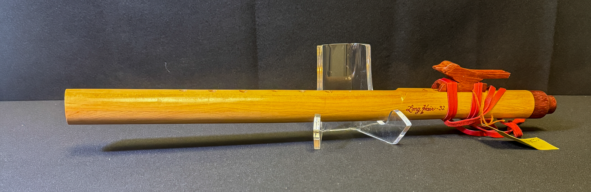 The block is shaped from red heart wood in a stylized bird form and tied securely with a matching red wrap. The overall contrast between the three woods creates a visually balanced and refined instrument.
