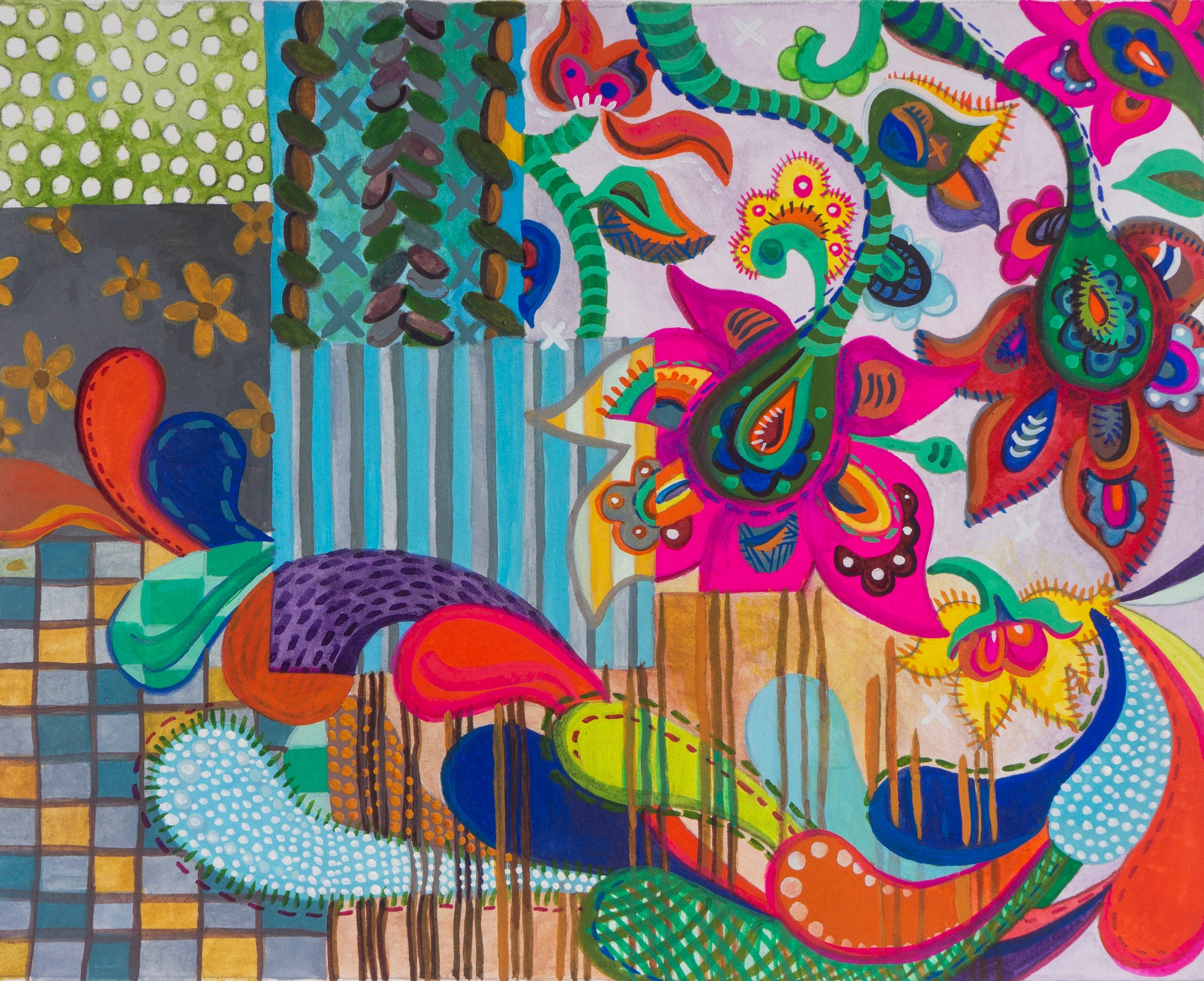 This composition incorporates patterns from my grandma’s house and wardrobe (mid-century curtains, sweaters, tile, etc.) combined with ones representing my love of Southeast Asia and the corresponding color preferences in both of our lives.