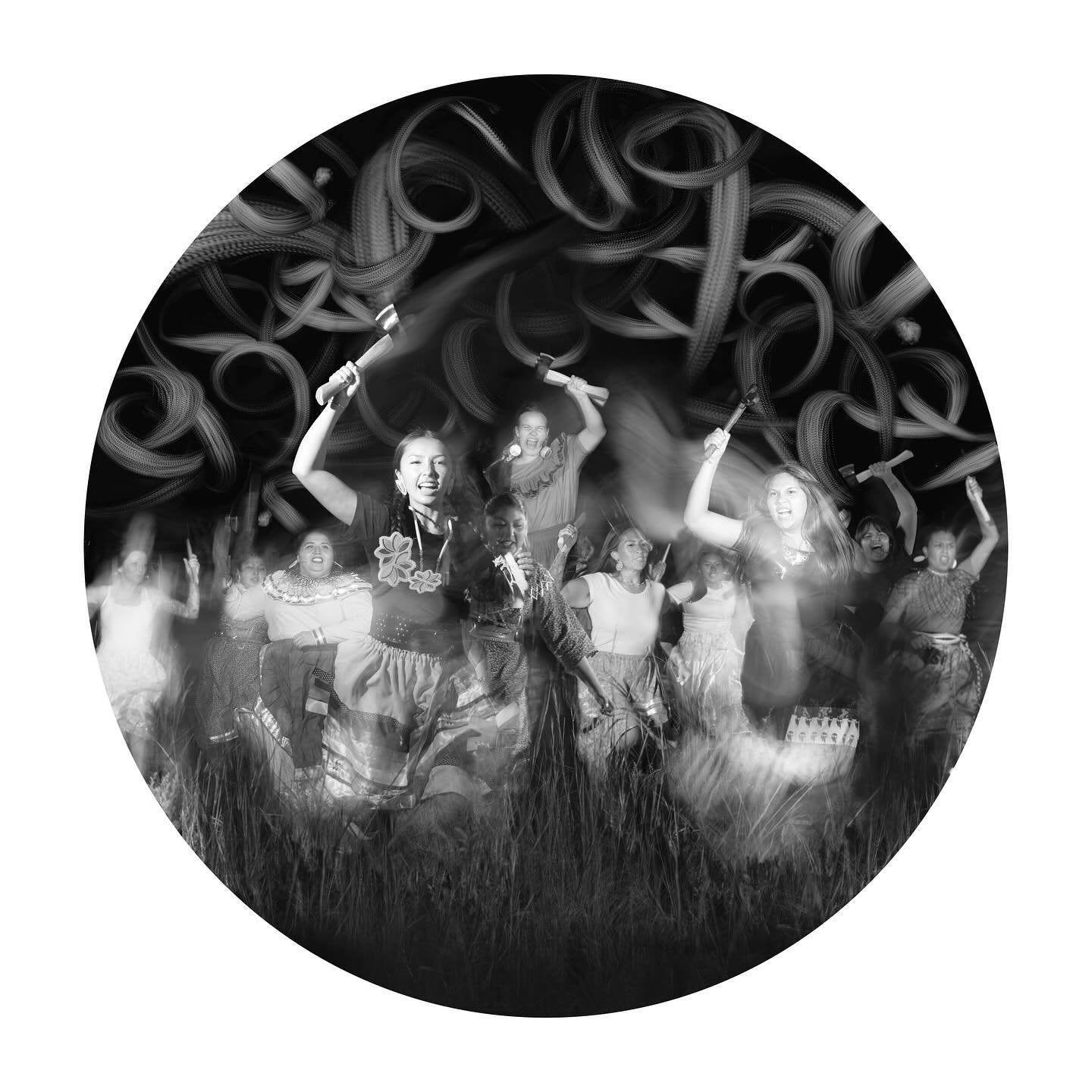 This lens-based piece utilizes traditional markings found on shell carvings/gorgets from the Mississippian period of our early southeastern ancestors. These markings represent wind, water, or clouds-and in the case of this image- they represent the turbulent shift of time. Using a fiberoptic light brush, I painted the ꞌPꞌ or ꞌ9ꞌ shaped markings in the night sky around the models while they stood before the camera. This contemporary depiction of the battle is not only an homage to the brave women who turned the tide at Ackia, but also a testament to the resilience and strength of their daughters who will forever stand ready to take up the hatchet in defense of their people. The marks of our ancestors remind us that linear time has never ruled our understanding of the world and that our strength lives forever in each other.