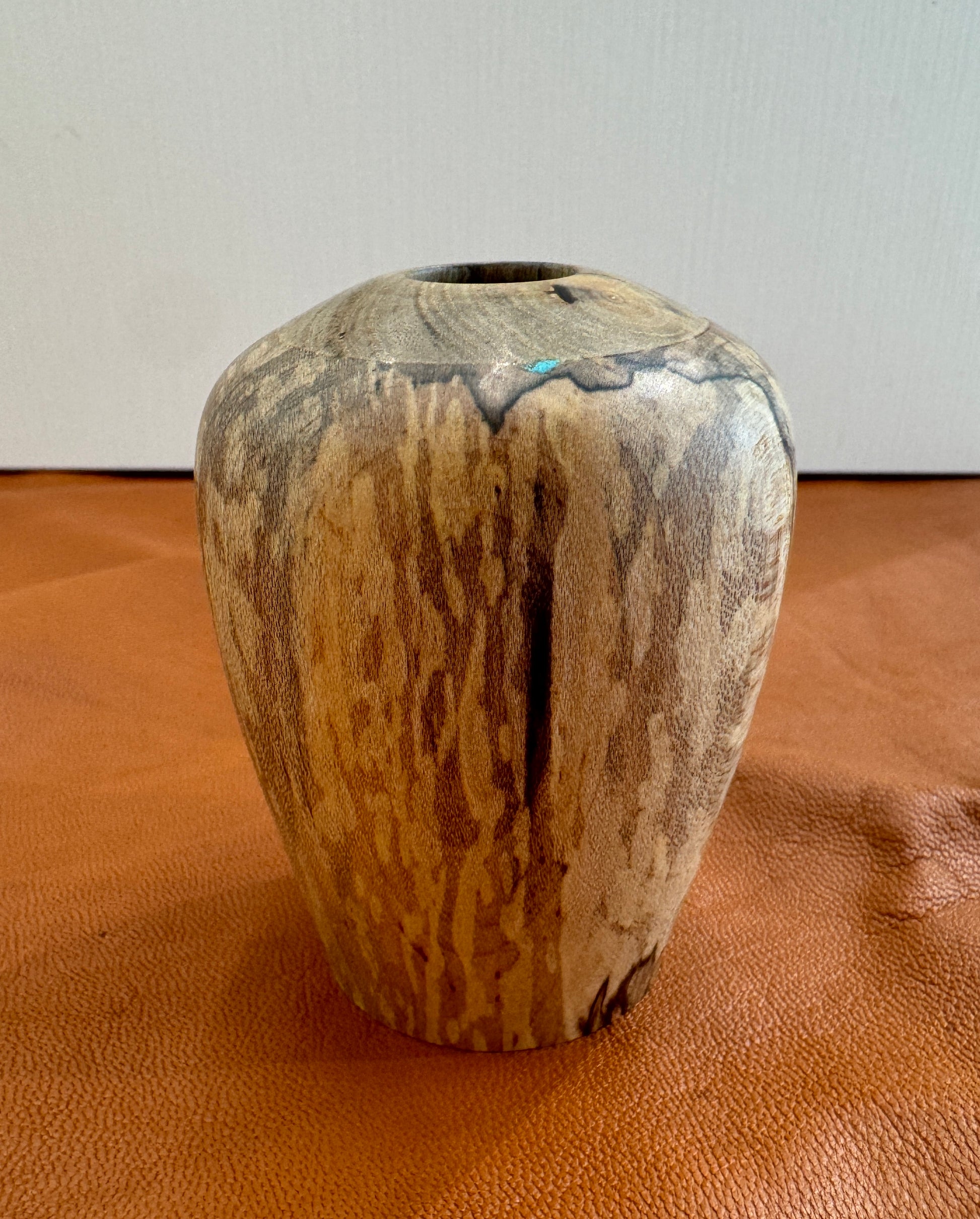 This hand-turned miniature vessel by Chickasaw artist Micah Hart highlights the beauty of natural wood and careful craftsmanship. Made from maple and ash, the form is smooth and balanced, allowing the wood grain to remain the focal point. Subtle inlaid blue stones near the rim add a bit of contrast without overwhelming the piece.