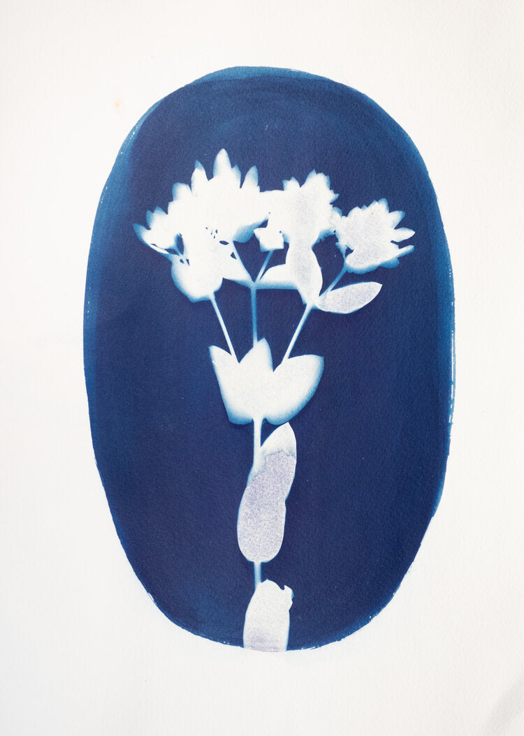 The cyanotype process is a photographic process. Two chemicals, ammonium iron citrate and potassium ferricyanide, are combined to create a UV light sensitive solution. The solution is applied to a surface like paper. An object is placed on the treated surface and exposed to a UV light source, like the sun. After a certain amount of time the object is removed and the paper is rinsed in water. This stops the developing process and creates a permanent image. Places on the print that are white blocked the light from coming through. Areas in blue are places where light was able to penetrate the object or bend around the object. This type of photograph is called a photogram. It is a true to life image of whatever has been placed on the paper.