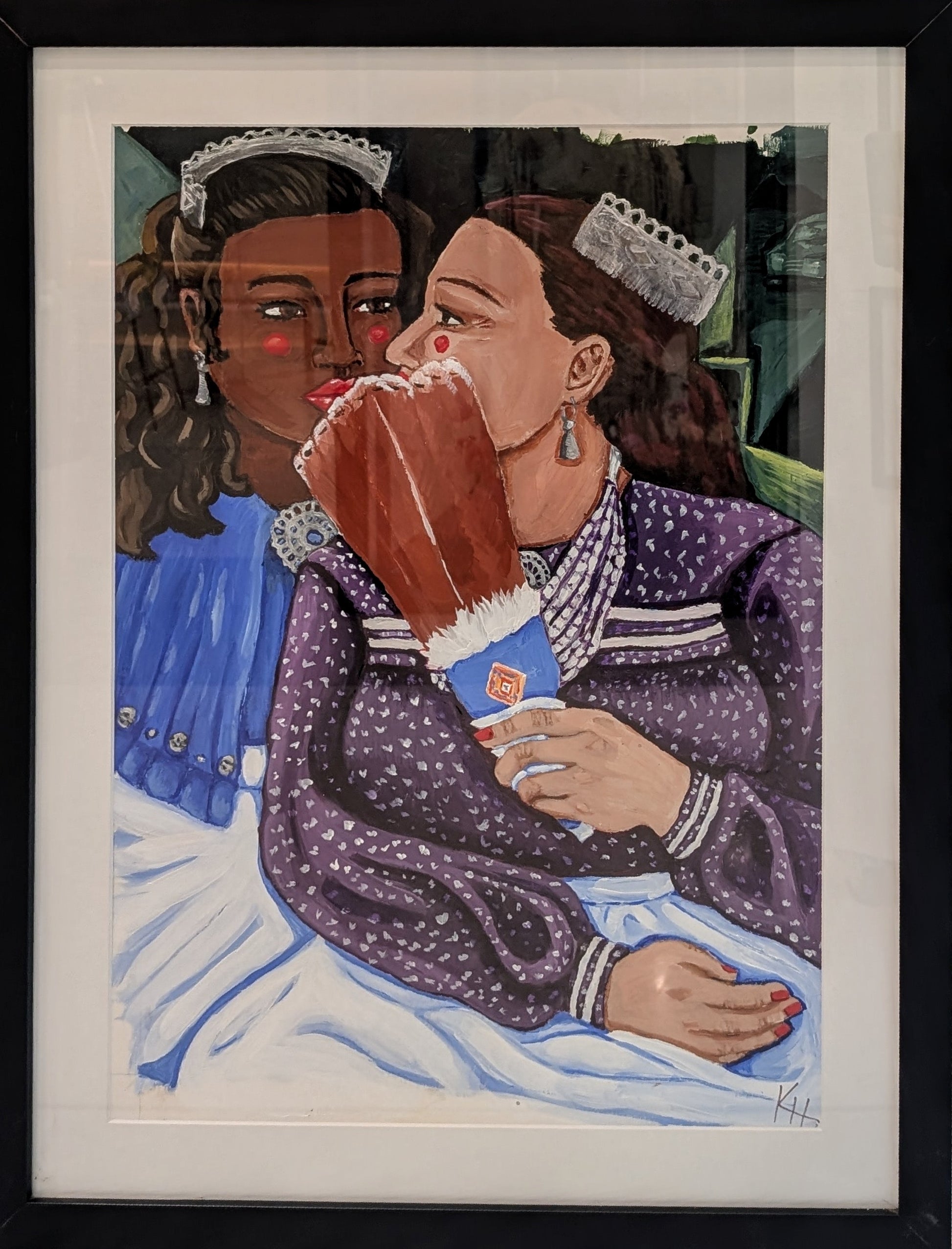 The work depicts a deeply intimate moment, perhaps witnessed as an unintentional glance across the arena. The woman in the foreground guards her face with her fan, which directs the viewer away from the vibrant colors and lines of the regalia to the women and their faces. The fan directs the eye to how close the women must be sitting, their faces almost touching, the hints of their mouths close enough to impart a kiss or a whisper. The women hold unbroken eye contact, their attention trained away from the ceremonial dances underway. The title of the piece itself is a cheeky reference to this apparent intimacy-- they could be two relatives gossiping on a bench, but they are not.