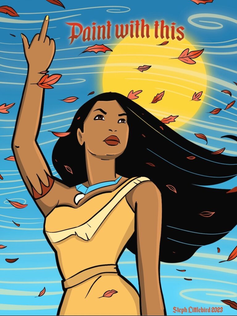 A reimagined image of Pocahontas flips the script on passive portrayals. With her middle finger raised and the phrase “Paint with this” overhead, this piece calls out the appropriation of Indigenous identity in American pop culture and affirms the power of Indigenous women to define their own stories.