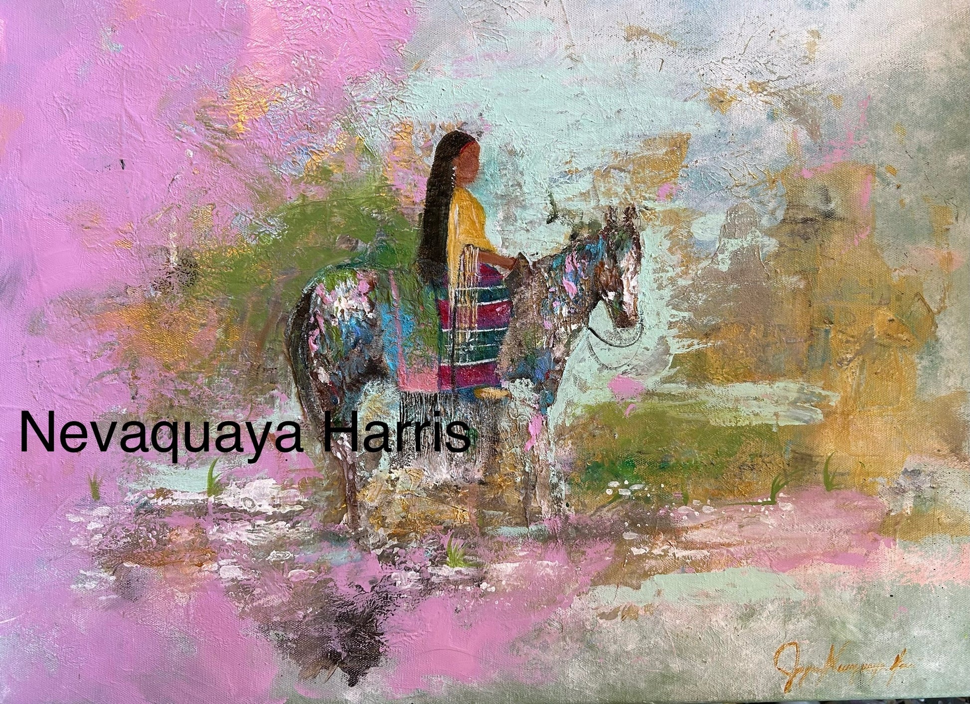 Joyce Nevaquaya Harris (Comanche Nation) hails from the Penetuka and Yamparika bands, with ties to the Little Pony and Black Knife Society. She is also of Crow and Chickasaw descent. Joyce grew up surrounded by art and artists, including her late father, Doc Tate Nevaquaya, a self-taught artist and Native flute revivalist. She honors the importance of continuing to paint Indigenous stories and history while carrying on her father's legacy of art.