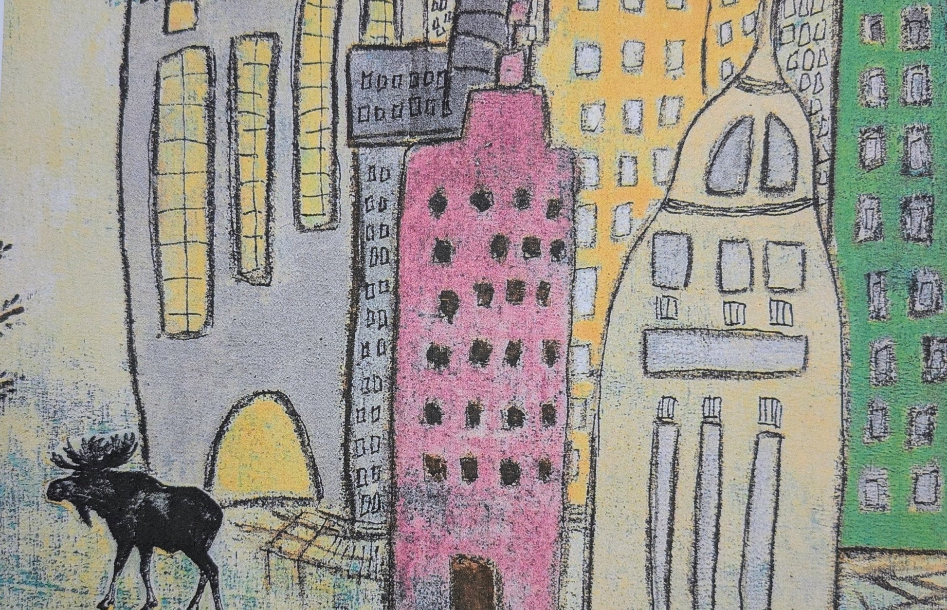 Moose carries medicine for those seeking to move through the deeper emotional places and rise with intuitive clarity. It represents the primal feminine and the capacity to open unique and sacred energies, guiding us toward nourishment drawn from our inner wells. In this piece, Moose steps quietly through a city of tall, bright buildings, appearing as a steady presence amid the noise of modern life. It invites us to trust our instincts and to return to the source of our own resilience.