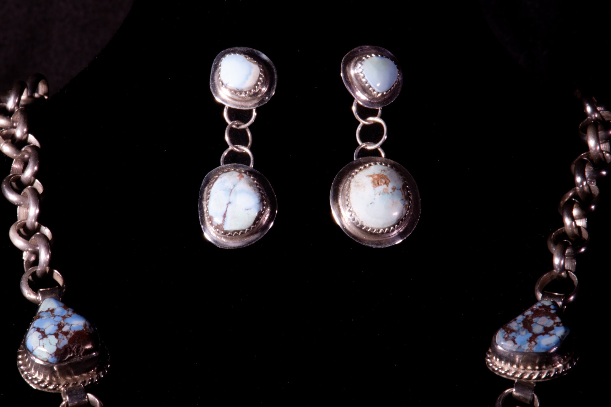 This striking turquoise set brings together the work of two accomplished Native artists. The necklace is handcrafted by Monica Silva Lovato (San Felipe Pueblo) and features five Natural Golden Hills turquoise cabochons. Each stone is set in sterling silver with a twisted-rope border and clean oval bezels. The stones measure about 1 inch each and are linked with sturdy sterling connectors that create a smooth and comfortable drape. The total necklace length is 22 inches, making it a versatile statement piece.