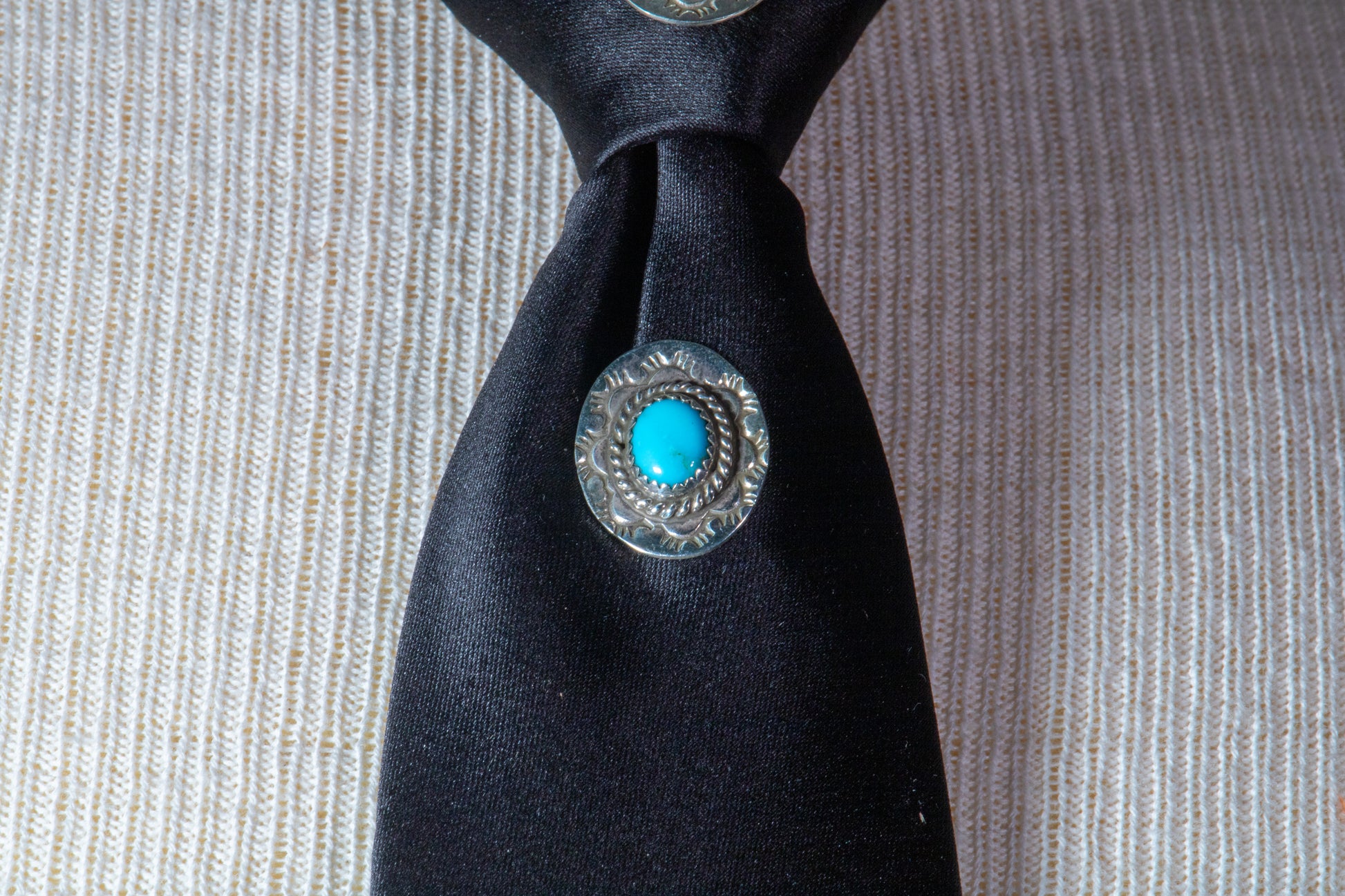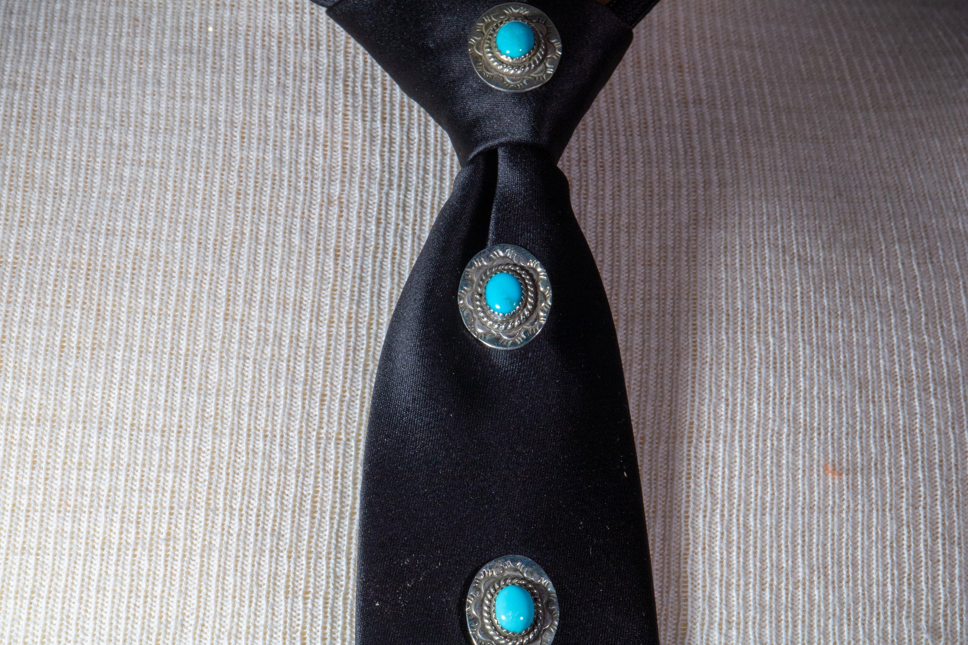 This contemporary concho tie by Monica Silva Lovato blends modern styling with traditional Pueblo silverwork. Nine sterling silver conchos, each set with a vibrant Sleeping Beauty turquoise cabochon, run the full length of a sleek black tie. Every concho carries hand-stamped detailing and a domed profile, giving the piece texture, depth, and a clean visual rhythm.