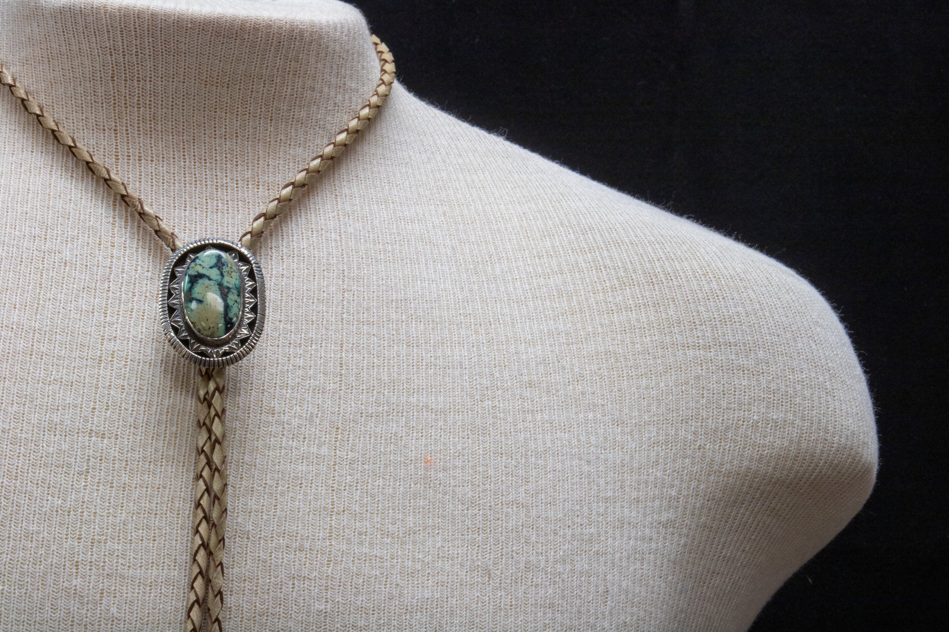 Bolo Tie • Artist: Dennis Chuculate • Tribe: Acoma Pueblo / Cherokee • Cord length: 18 in • Stone: Natural New Lander Variscite • Stone size: approx. 1 1/4 in • Full silver setting: approx. 2 in • Materials: Sterling silver, Natural New Lander Variscite, braided leather • Condition: New