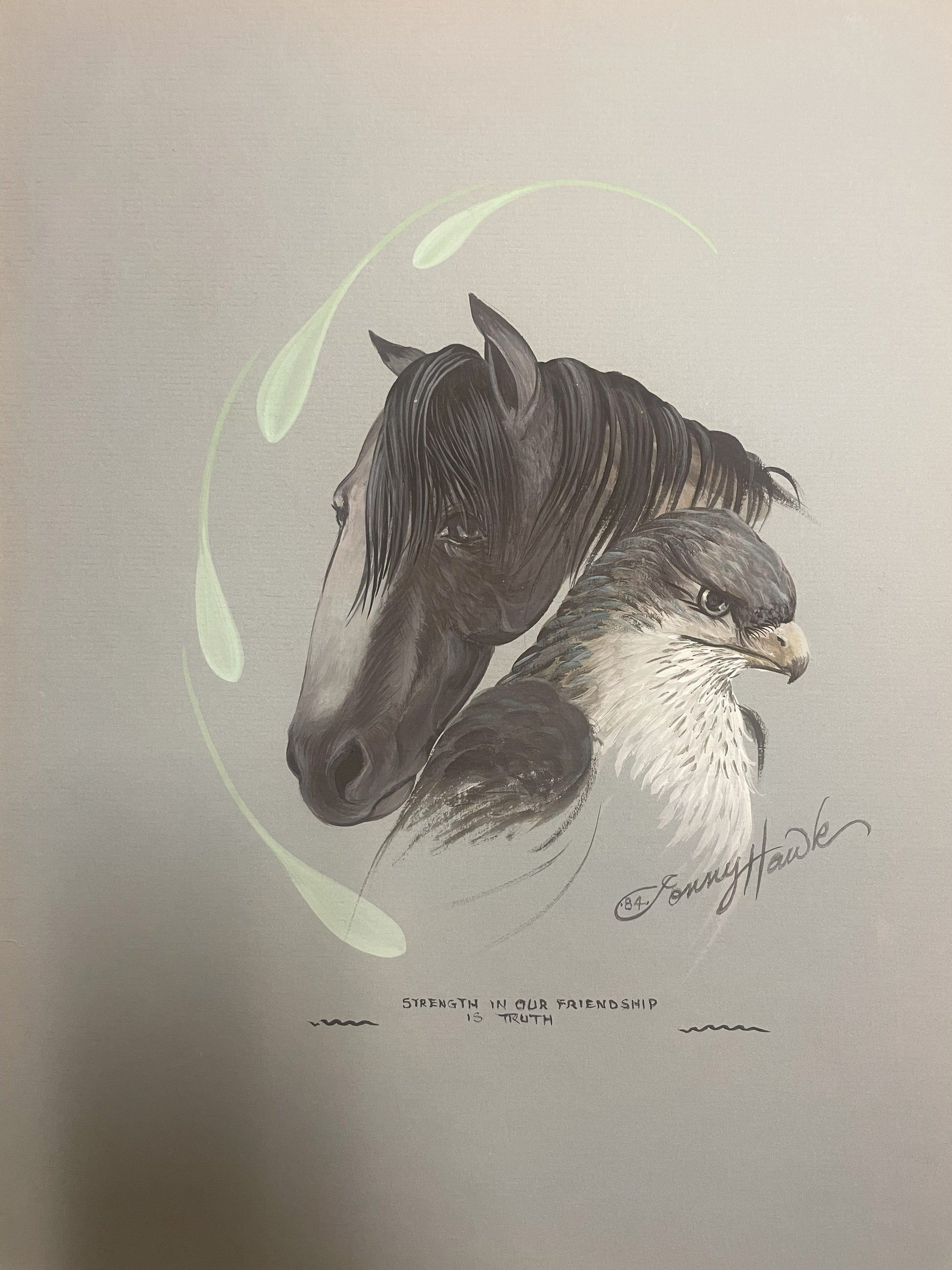 Johnny Hawk attended OK State University and has painted most of his life as a career. He paints with acrylic and watercolor. He has won numerous awards during his career, including recognition at the Cherokee National Museum, Five Civilized Tribes Museum, The Philbrook Museum of Art, The Heard Museum as well as many others. He participated in the Franco-American Institute Exhibition in France. Many of his artwork include spiritual or inspirational messages that add uniqueness and meaning to his beautiful art.