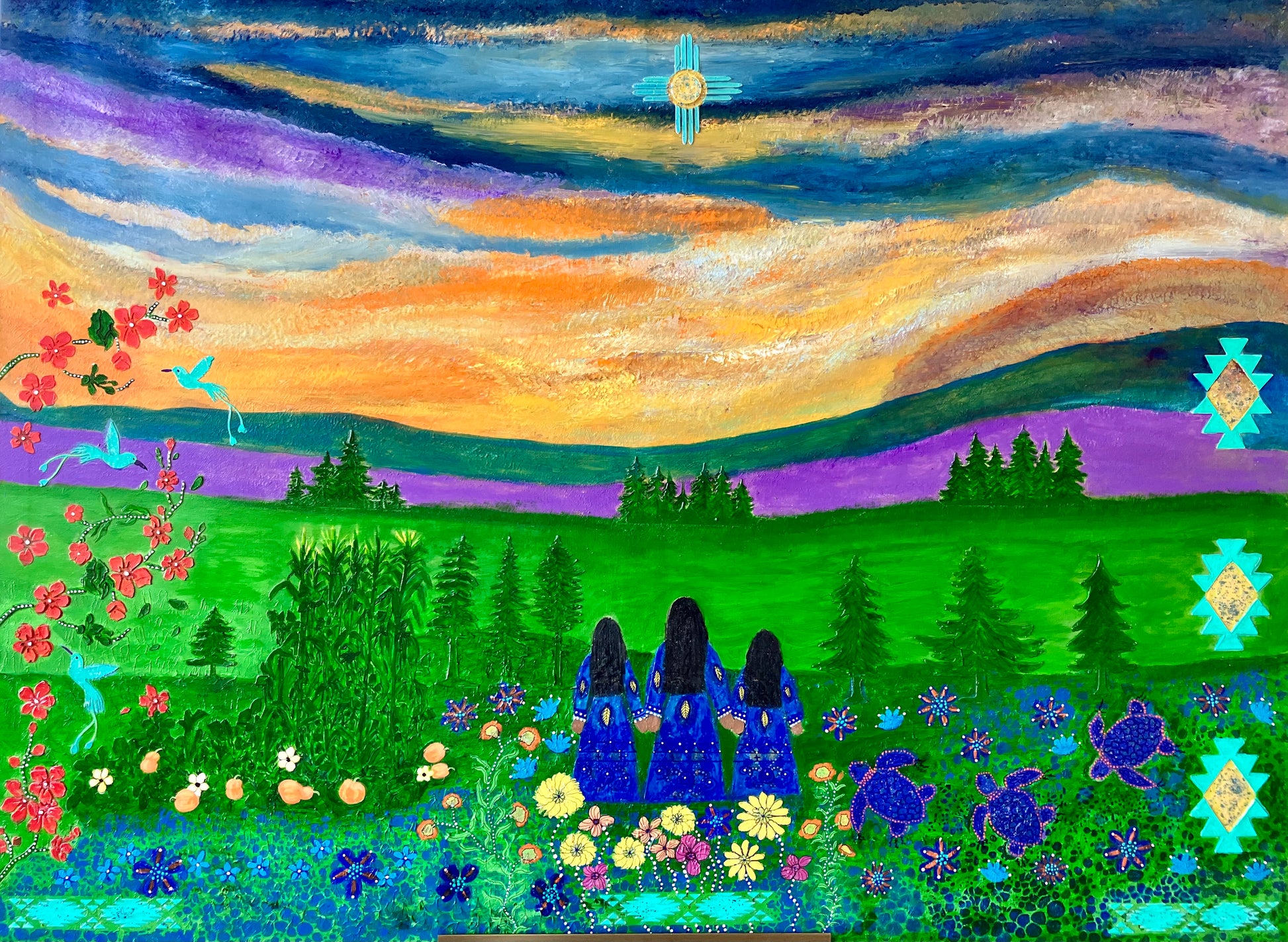 Recently I was commissioned to create a Three Sisters Garden painting for a health agency in North Carolina, which would be used as a logo for t-shirts. After completing this logo, I created this large-scale painting showing what the Three Sisters Garden would look like in a whimsical environment. Native American conversations often center around the environment and the earth. They believe it is important to consider what will affect the next seven generations. These beliefs include the concept of the Three Sisters Garden of squash, corn, and beans. This turned out to be one of my favorite paintings and is currently on exhibit at the Museum of the Southeast American Indian, the University of North Carolina in Pembroke, NC, my alma mater. The composition shows the three sisters growing corn, beans, and squash in the same mound in the garden. The corn provides a ladder for the bean vine. They together give shade to the squash. The Native American stories of the Three Sisters vary from tribe to tribe. The sisters are facing a beautiful sunset with beautiful clay-formed hummingbirds and flowers adorning the background. A spiritual, mystical scene is captivated with breathtaking color schemes. Honoring our Lady ancestor farmers continues to feed us with nourishment while respecting those legends before us.