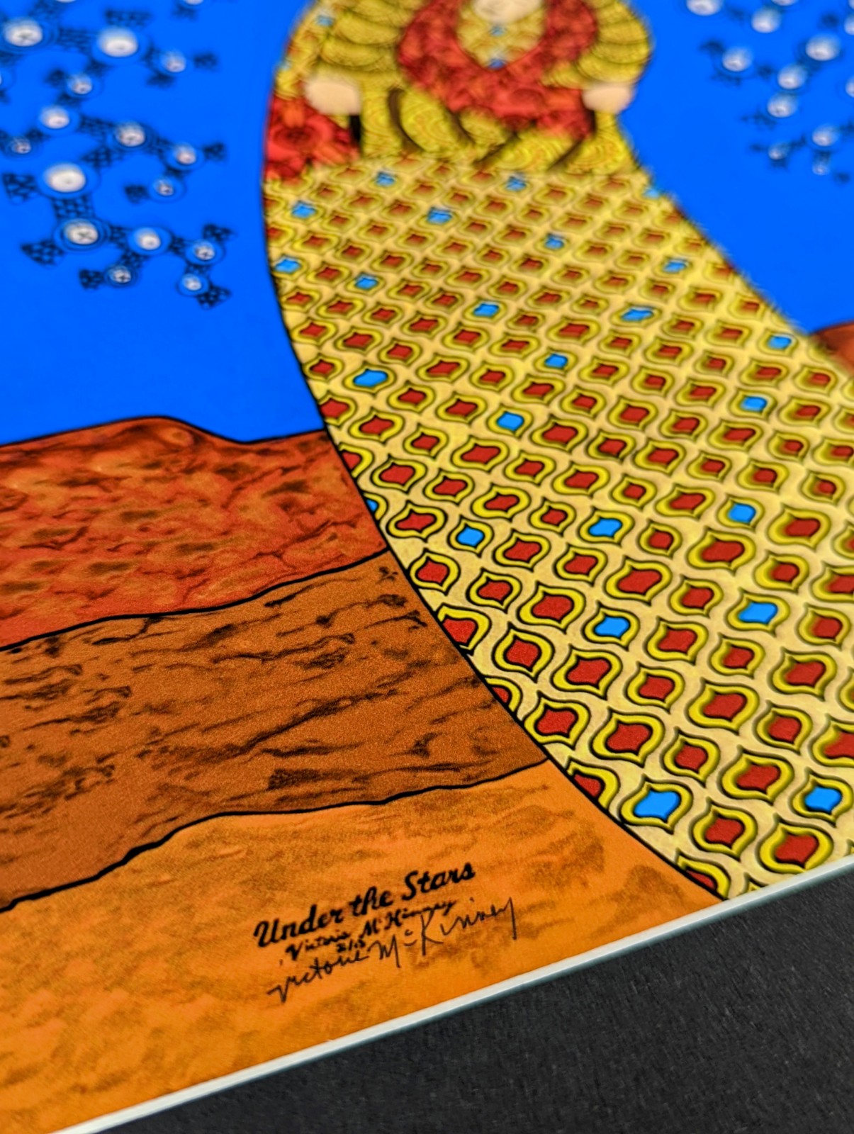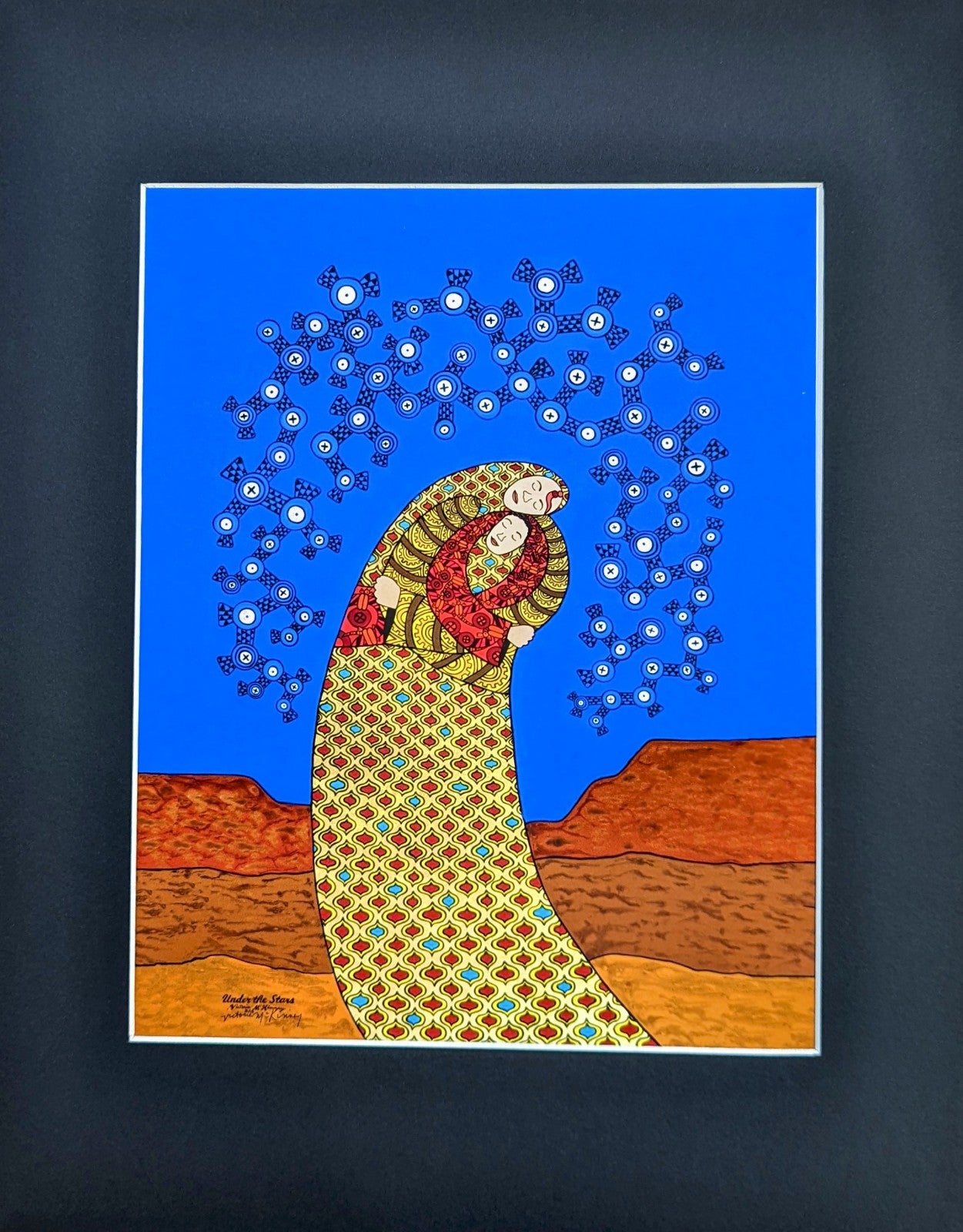 Using motifs from Mound Builder sites this painting depicts two entwined lovers and was inspired by a work by Gustav Klimt entitled "The Kiss."