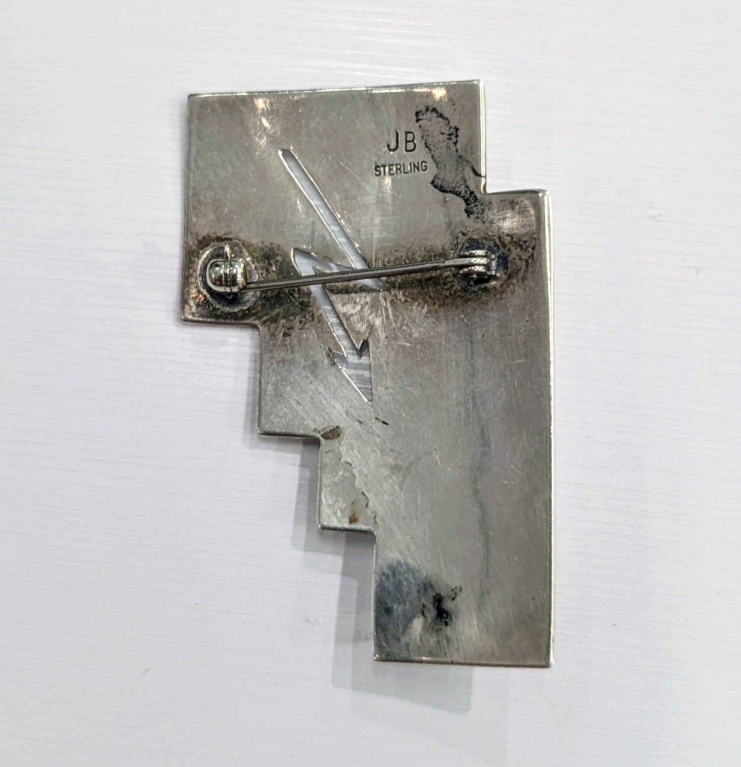 Stamped JB and Sterling on the back, the pin shows careful metalwork with a sturdy clasp and a polished finish. A distinctive vintage accessory that blends classic stonework with sharp, modern lines.