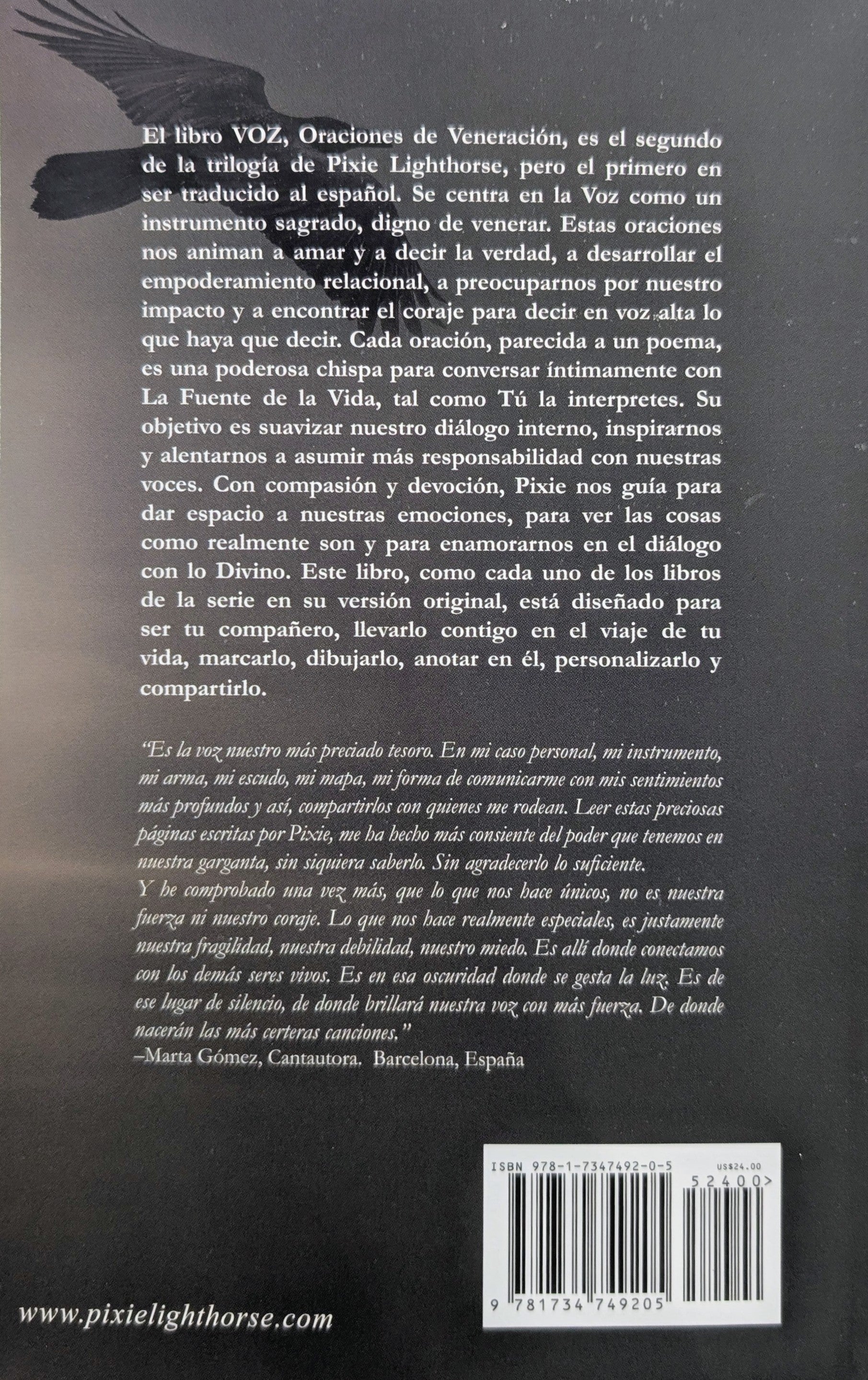 Voz: Oraciones de Veneración es la edición en español de Prayers of Honoring Voice, parte de la aclamada serie Oraciones de Veneración de Pixie Lighthorse (Choctaw, Creek, Chickasaw). Esta edición se centra en la Voz como un instrumento sagrado, una fuerza para la verdad, el amor y la sanación en nuestras relaciones. A través de oraciones poéticas y reflexivas, Lighthorse anima a los lectores a expresarse con honestidad, compasión y responsabilidad.