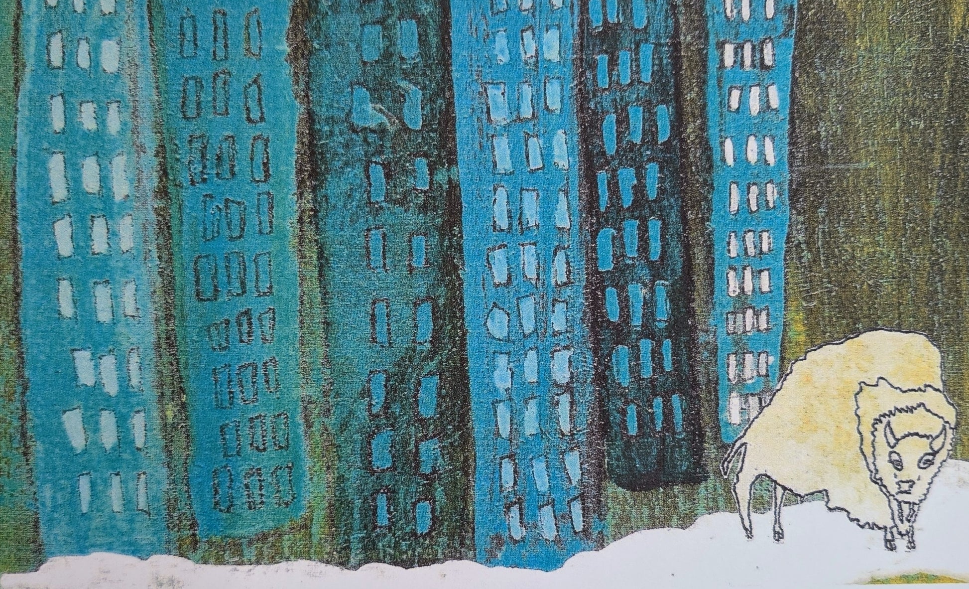 White Buffalo portrays the sacred strength and peace of one of Native tradition’s most meaningful symbols. Against a backdrop of tall, cool-toned city buildings, the white buffalo walks with quiet purpose, bringing teachings of gratitude, endurance, and spiritual balance. The artwork reminds us to walk our own authentic path and to honor life in all its forms.